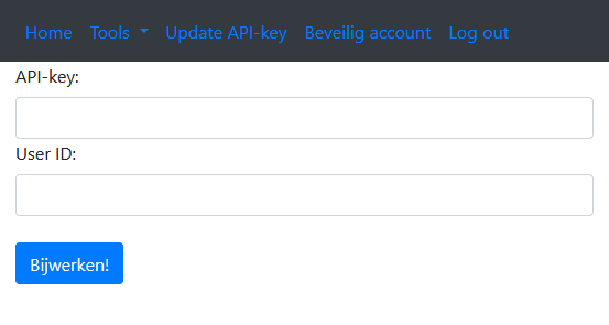 Je kan de API-key verkrijgen onder je account settings, klik hierop het organisatie logo rechtsboven in, en klik vervolgens op je naam, hier kan je API-key weergeven. Je zult hiervoor je wachtwoord moeten invullen. Daarnaast heb je je user id nodig. Deze staat in de URL /users/