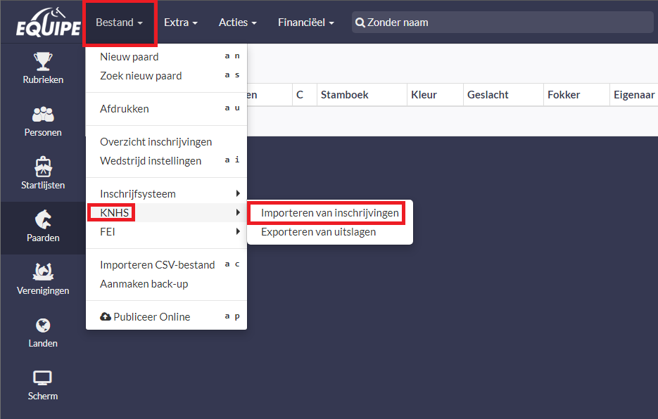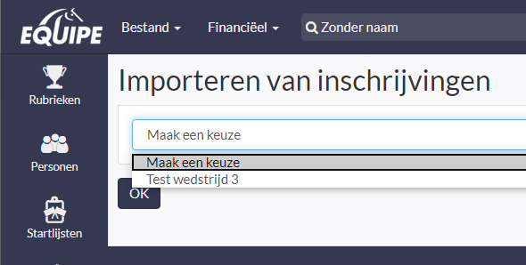 Zodra je wedstrijd staat ingeladen, kan je deze kiezen binnen Equipe. Het inladen van inschrijvingen is ook mogelijk, nadat je al de wedstrijd rubrieken hebt ingeladen. Kies in een lege wedstrijd -> bestand -> KNHS -> Importeren van inschrijvingen. Hierna krijg je een lijstje van mogelijke wedstrijden, kies de wedstrijd die je wilt inladen. Vervolgens druk je op OK, en aan de hand van hoeveel starts en rubrieken je hebt moet je even wachten.