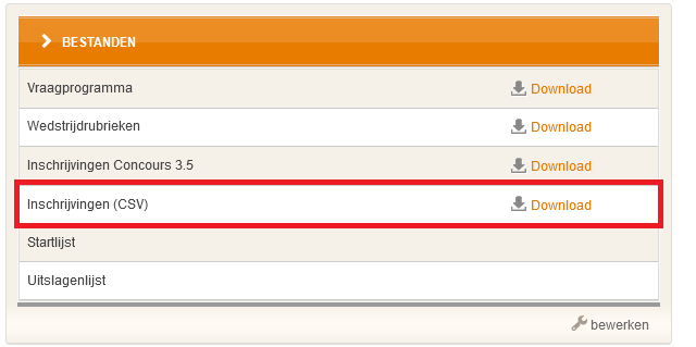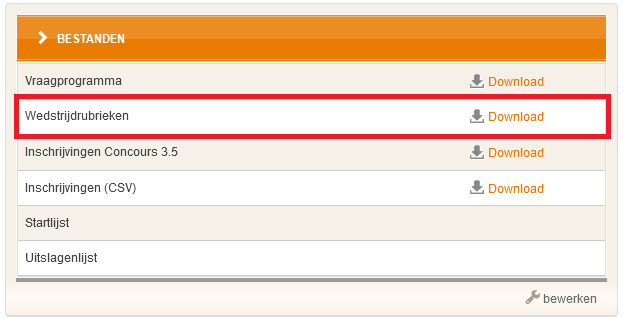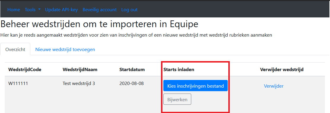 Inschrijvingen die zijn gedaan via mijnKNHS kunnnen ook worden ingeladen. Op de overzichts pagina, staat de wedstrijd vermeld in de tabel. In de rij "Starts inladen" kun je het inschrijvingen bestand van de KNHS kiezen en deze inladen in het systeem. Het inschrijvingen bestand download je van mijnKNHS, zie foto welke download je moet hebben. Als het bestand hebt gekozen, klik je op bijwerken. Zodra alles starts zijn geïmporteerd, kom je automatisch weer terug op het overzichts scherm.
