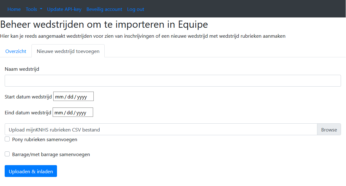 Hier vul je de naam in, de start en eind datum in. Vervolgens kies je het KNHS wedstrijdrubrieken bestand. Dit bestand download je uit mijnKNHS(wedstrijd & activiteiten -> achter de wedstrijd de knop "bewerken"), zie foto voor welke download je moet hebben